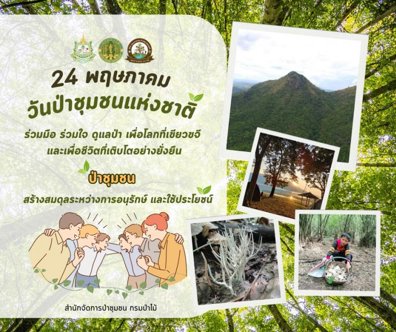 รายละเอียด : 24 พฤษภาคม ของทุกปีถูกกำหนดให้ เป็นวันป่าชุมชนแห่งชาติเพื่อน้อมรำลึกถึงพระมหากรุณาธิคุณและสืบสานพระราชปณิธานของสถาบันพระมหากษัตริย์ไทยในด้านการส่งเสริมและพัฒนาทรัพยากรป่าไม้ตลอดจนเพื่อส่งเสริมให้ประชาชนได้มีส่วนร่วมในการจัดการและใช้ประโยชน์จากป่าชุมชนอย่างสมดุลและยั่งยืนโดยปีนี้จัดขึ้นภายใต้แนวคิด “Community Forests for the Future ป่าชุมชน สู่อนาคตที่ยั่งยืน” เพื่อจะสะท้อนให้เห็นถึงความร่วมมือของชุมชนทั่วประเทศที่มีบทบาทสำคัญในการดูแลรักษาป่าและทรัพยากรธรรมชาติที่จะคงเป็นมรดกให้ลูกหลานสืบไปป่าชุมชน ไม่ได้เป็นเพียงป่าของรัฐที่ให้ชุมชนร่วมบริหารจัดการแต่คือแหล่งทรัพยากรที่มีคุณค่าทางเศรษฐกิจ สังคม และสิ่งแวดล้อม โดยเฉพาะในอนาคตที่ประเทศไทยและโลกกำลังเผชิญกับวิกฤติสิ่งแวดล้อม ภัยพิบัติ และการเปลี่ยนแปลงสภาพภูมิอากาศ ดังนั้น ป่าชุมชน จึงถือเป็นเครื่องมือสำคัญในการลดผลกระทบจากการเปลี่ยนแปลงสภาพภูมิอากาศ และยังเพิ่มความมั่นคงทางเศรษฐกิจของชุมชนอย่างยั่งยืน ช่วยเสริมสร้างความสมดุลระหว่างมนุษย์และธรรมชาติในระยะยาว