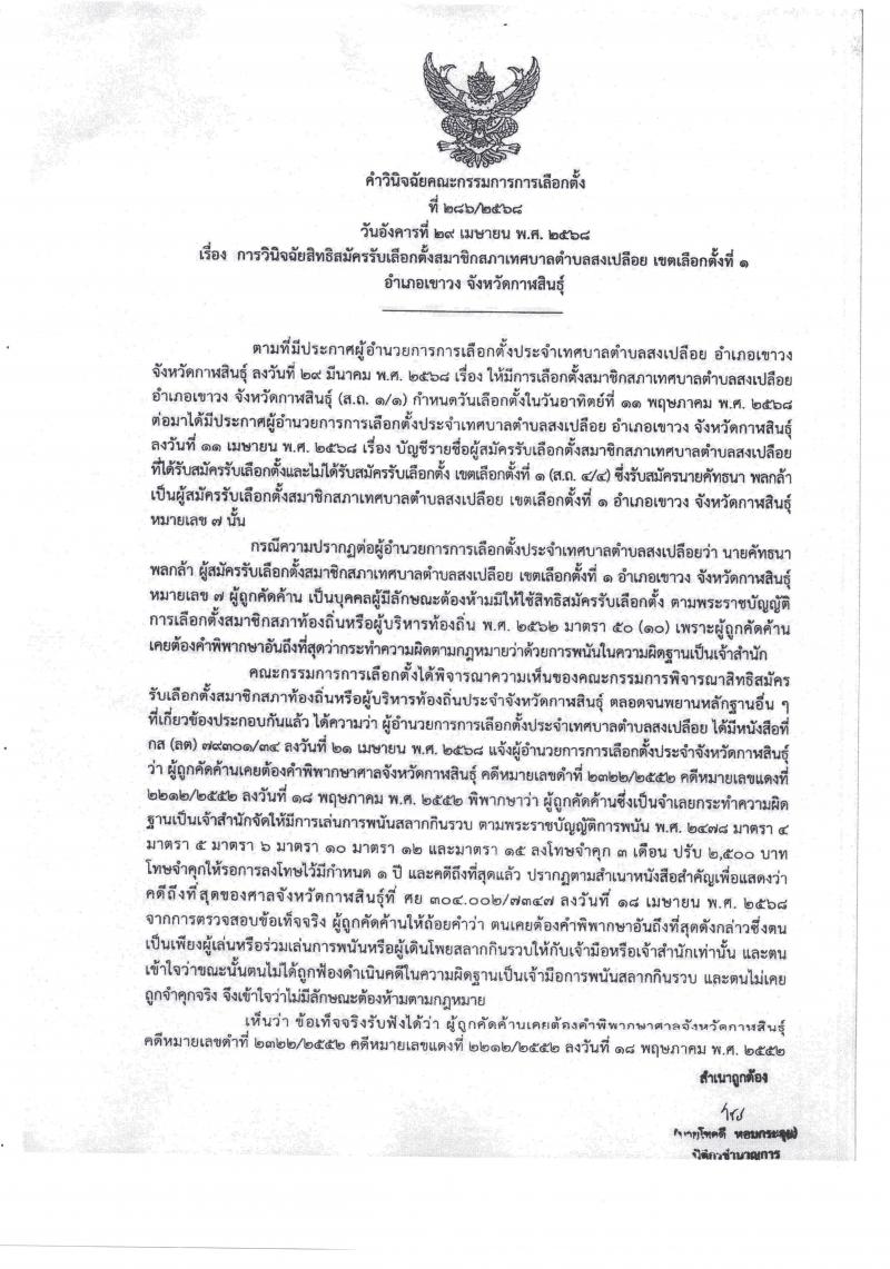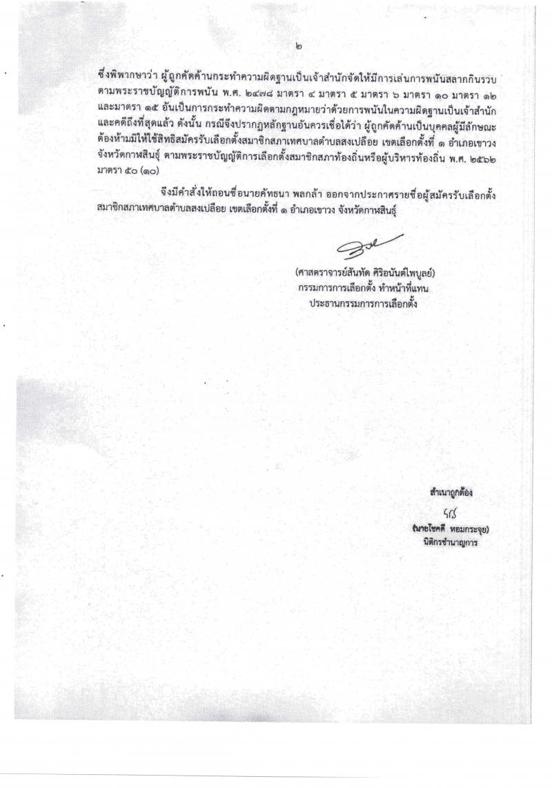 ประกาศผู้อำนวยการการเลือกตั้งประจำเทศบาลตำบลสงเปลือย เรื่อง ถอนชื่อผู้สมัครรับเลือกตั้งสมาชิกสภาเทศบาลตำบลสงเปลือย ตามคำวินิจฉัยคณะกรรมการการเลือกตั้ง ที่ 286 /2568 ลงวันที่ 29 เดือน เมษายน พ.ศ. 2568 นายคัทธนา พลกล้า หมายเลขประจำตัวผู้สมัคร 7 เขตเลือกตั้งที่ 1