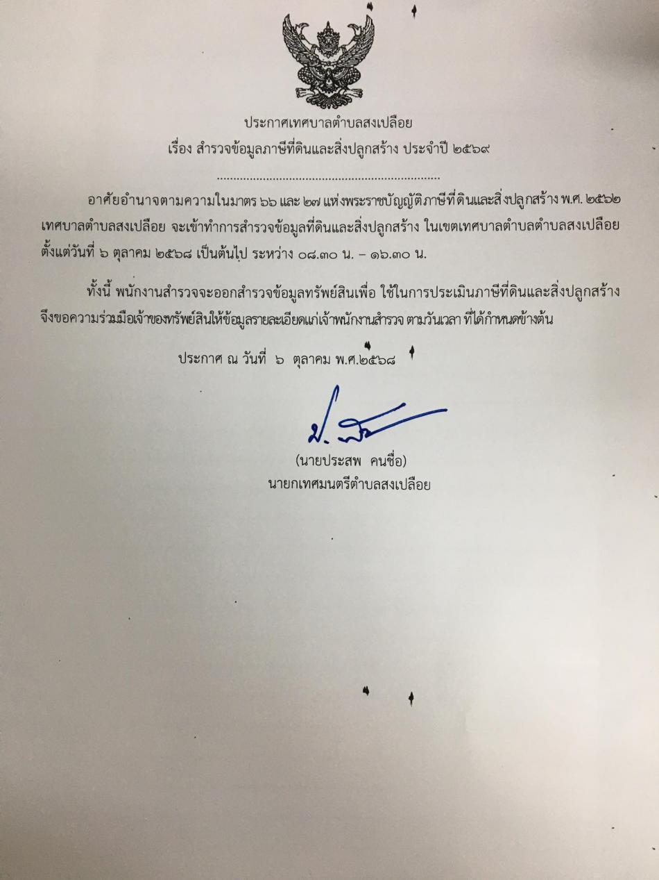เรื่อง สำรวจข้อมูลภาษีที่ดินและสิ่งปลูกสร้าง ประจำปี 2569 จะเข้าสำรวจข้อมูลที่ดินและสิ่งปลูกสร้าง ในเขตเทศบาลตำบลสงเปลือย ตั้งแต่วันที่ 6 ตุลาคม 2568 เวลา 08.30 น. - 16.30 น. [6 ตุลาคม 2568]