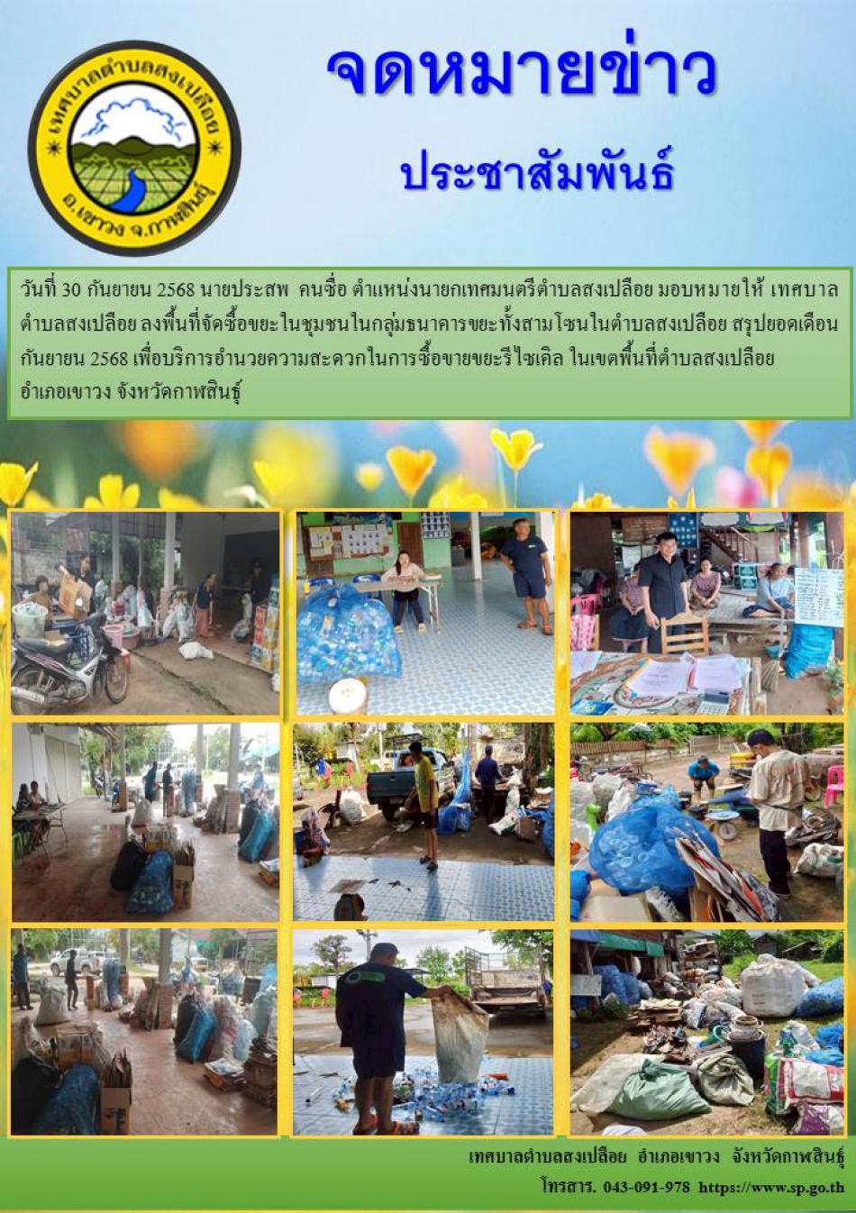 วันที่ 30 กันยายน 2568 นายประสพ คนซื่อ ตำแหน่งนายกเทศมนตรีตำบลสงเปลือย มอบหมายให้ เทศบาลตำบลสงเปลือย ลงพื้นที่จัดซื้อขยะในชุมชนในกลุ่มธนาคารขยะทั้งสามโซนในตำบลสงเปลือย สรุปยอดเดือน กันยายน 2568... [30 กันยายน 2568]