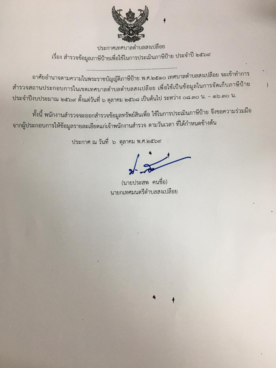 เรื่อง สำรวจข้อมูลภาษีป้ายเพื่อใช้ในการประเมินภาษีป้าย ประจำปี 2569 ในเขตเทศบาลตำบลสงเปลือย ตั้งแต่วันที่ 6 ตุลาคม 2568 เวลา 08.30 น. - 16.30 น. [6 ตุลาคม 2568]