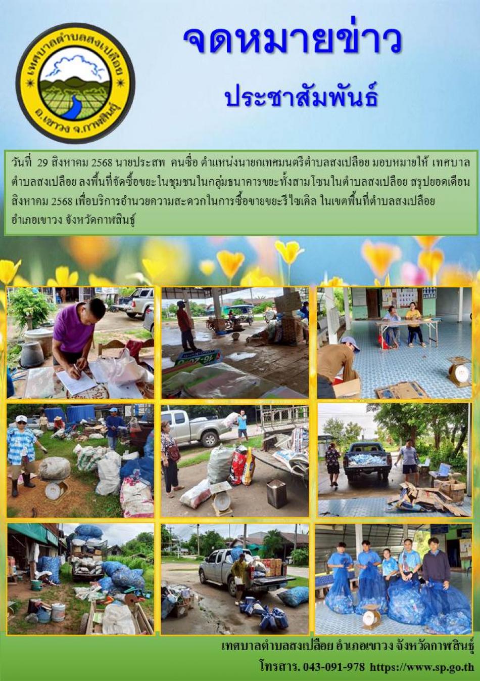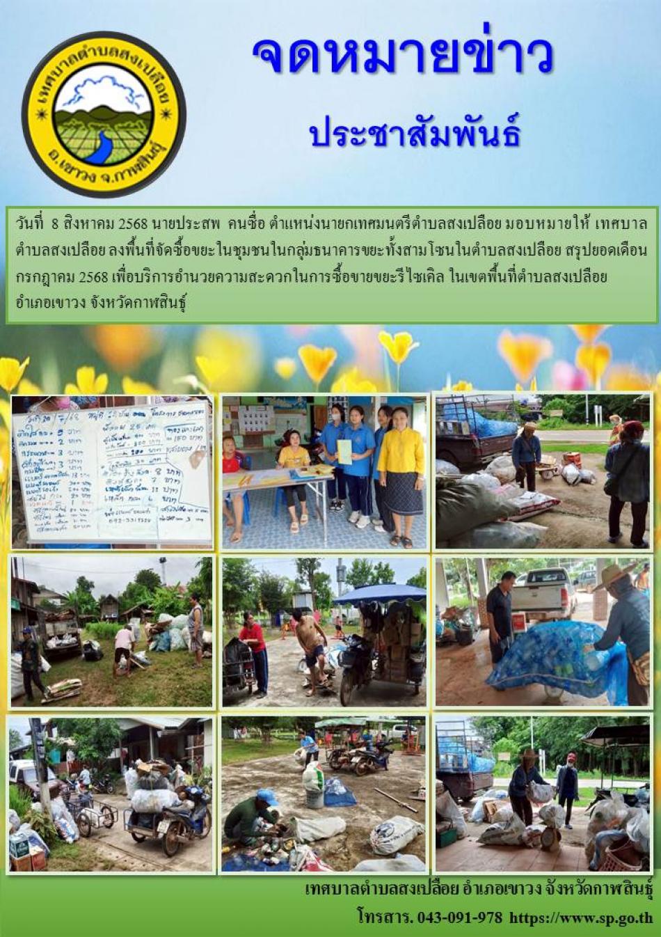 วันที่ 8 สิงหาคม 2568 นายประสพ คนซื่อ ตำแหน่งนายกเทศมนตรีตำบลสงเปลือย มอบหมายให้ เทศบาลตำบลสงเปลือย ลงพื้นที่จัดซื้อขยะในชุมชนในกลุ่มธนาคารขยะทั้งสามโซนในตำบลสงเปลือย สรุปยอดเดือน กรกฎาคม 2568... [8 สิงหาคม 2568]
