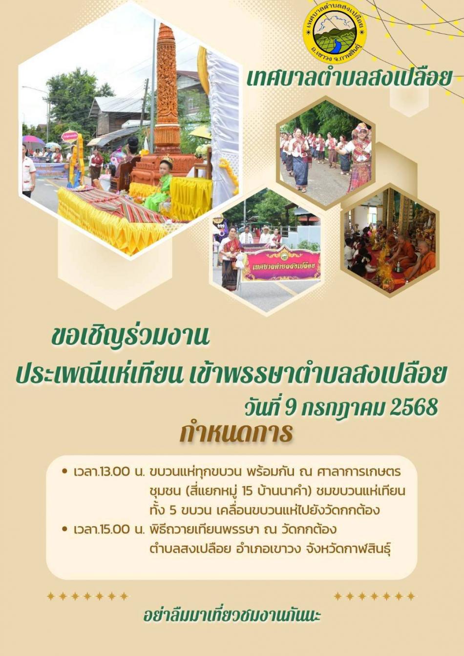เทศบาลตำบลสงเปลือย ขอเชิญร่วมงานแห่เทียนเข้าพรรษาตำบลสงเปลือย ประจำปี 2568 กำหนดการจัดงานในวันที่ 9 กรกฎาคม 2568 โดยมีขบวนแห่เทียนทั้ง 5 ขบวน จุดรวมขบวนแห่ ณ ศาลาเกษตรชุมชน บ้านนาคำ หมู่15 เวลา 13 .00 น.... [7 กรกฎาคม 2568]
