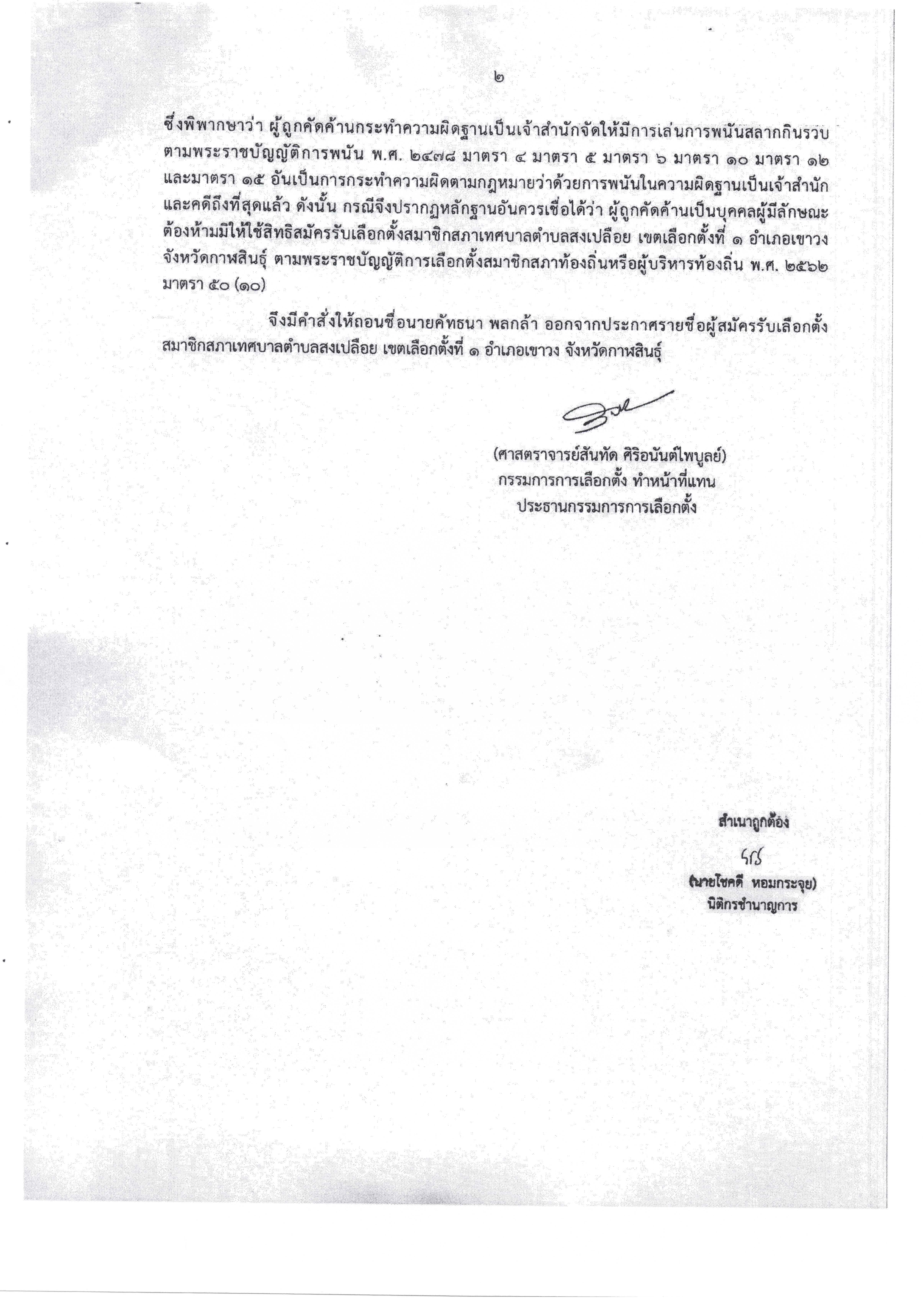 อาศัยอำนาจตามระเบียบคณะกรรมการการเลือกตั้งว่าด้วยการเลือกตั้งสมาชิกสภาท้องถิ่นหรือผู้บริหารท้องถิ่น พ.ศ. ๒๕๖๒ และที่แก้ไขเพิ่มเติม ข้อ ๑๑๒ วรรคสาม จึงประกาศถอนชื่อบุคคลดังกล่าวออกจากประกาศรายชื่อผู้มีสิทธิสมัครรับเลือกตั้งสมาชิกสภาเทศบาลตำบลสงเปลือย หมายเลขประจำตัวผู้สมัคร 7 เขตเลือกตั้งที่ 1 อำเภอเขาวง