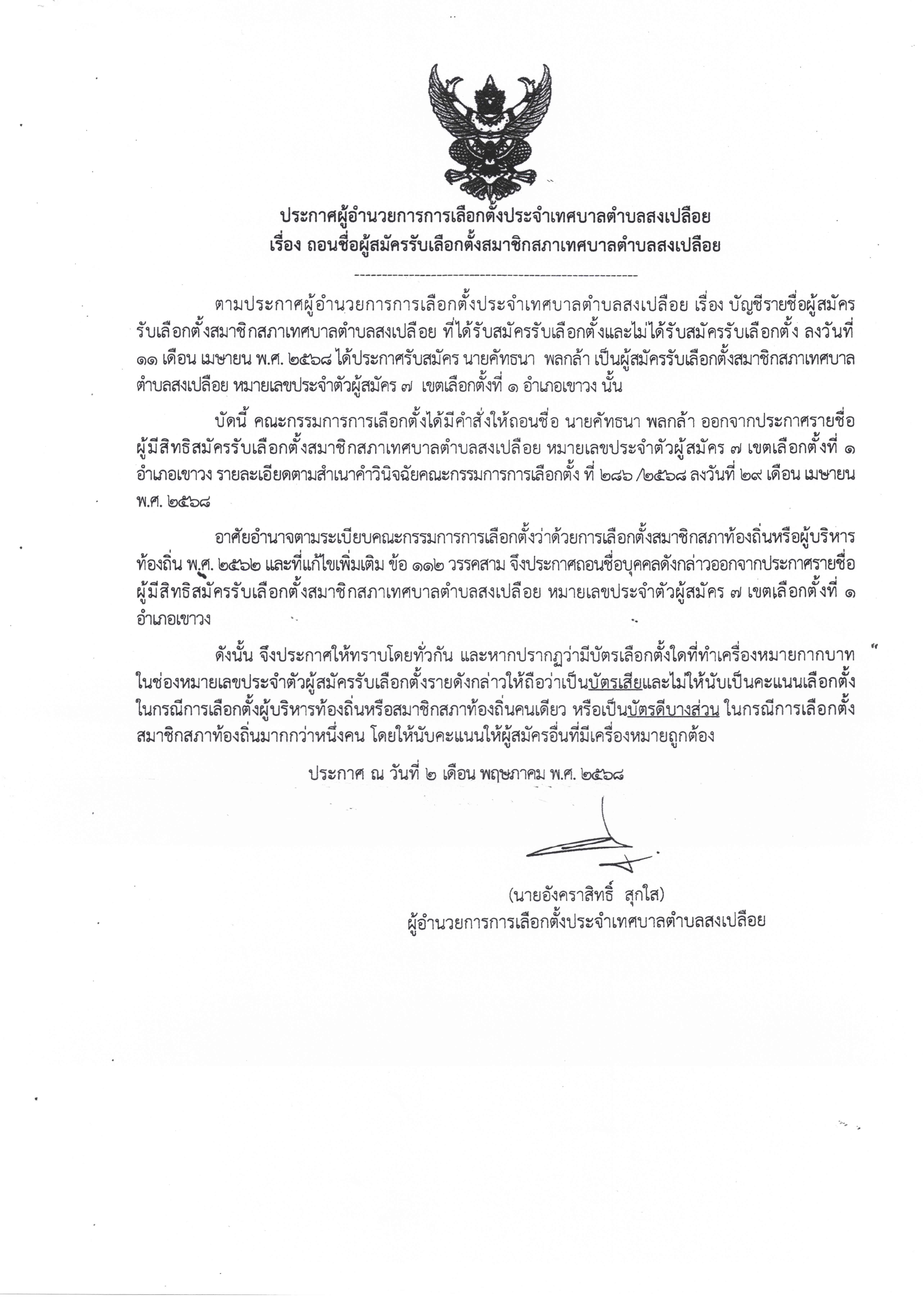 บัดนี้ คณะกรรมการการเลือกตั้งได้มีคำสั่งให้ถอนชื่อ นายคัทธนา พลกล้า ออกจากประกาศรายชื่อ ผู้มีสิทธิสมัครรับเลือกตั้งสมาชิกสภาเทศบาลตำบลสงเปลือย หมายเลขประจำตัวผู้สมัคร 7 เขตเลือกตั้งที่ 1 อำเภอเขาวง รายละเอียดตามสำเนาคำวินิจฉัยคณะกรรมการการเลือกตั้ง ที่ 286 /2568 ลงวันที่ 29 เดือน เมษายน พ.ศ. 2568