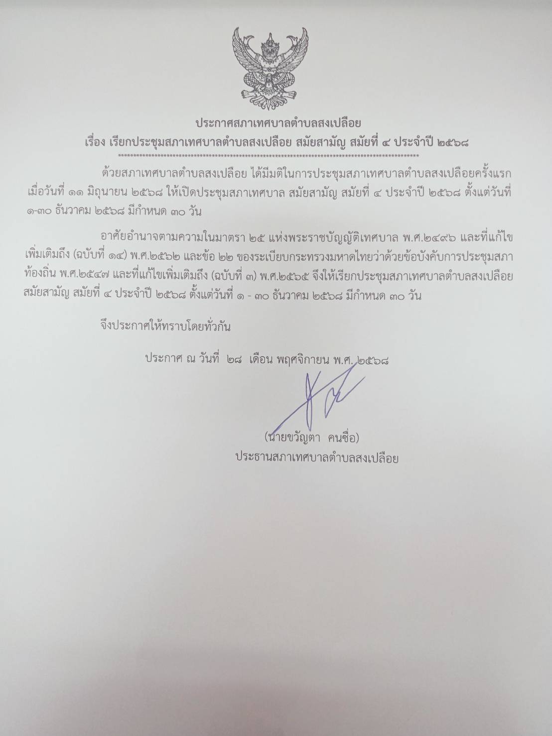 ประกาศสภาเทศบาลตำบลสงเปลือย เรื่อง เรียกประชุมสภาเทศบาลตำบลสงเปลือย สมัยสามัญ สมัยที่ 4 ประจำปี 2568