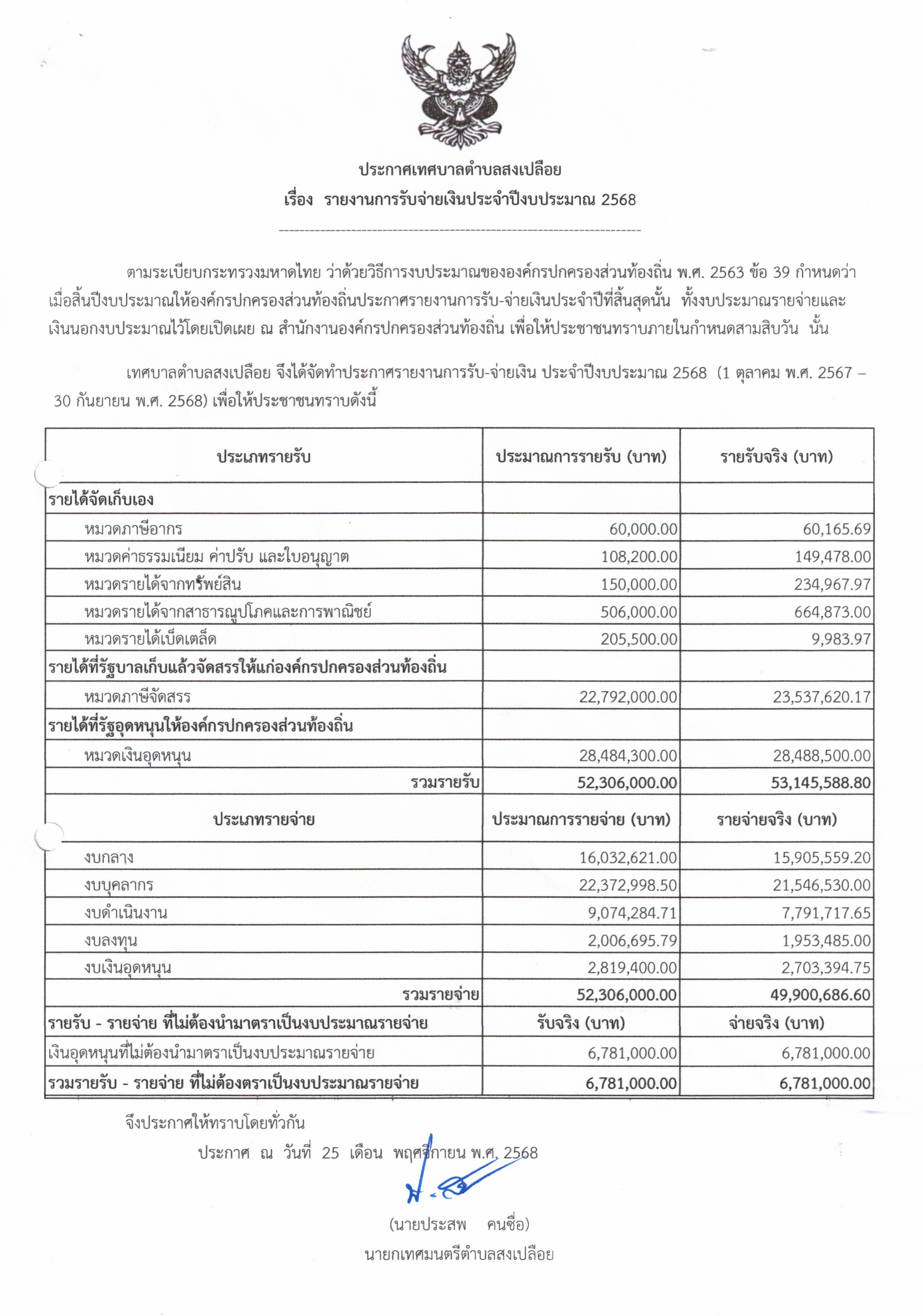 รายงานการรับจ่ายเงินประจำปีงบประมาณ 2568