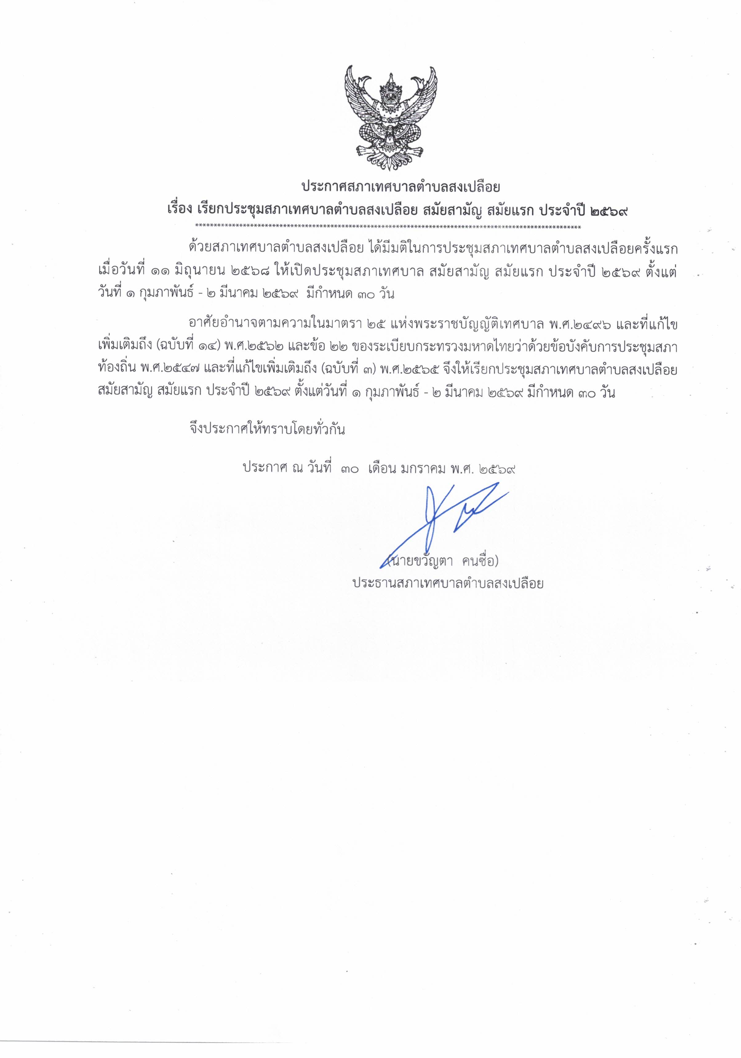 ประกาศสภาเทศบาลตำบลสงเปลือย เรื่อง เรียกประชุมสภาเทศบาลตำบลสงเปลือย สมัยสามัญ สมัยแรก ประจำปี 2569 (ตั้งแต่วันที่ 1 กุมภาพันธ์ - 2 มีนาคม 2569)